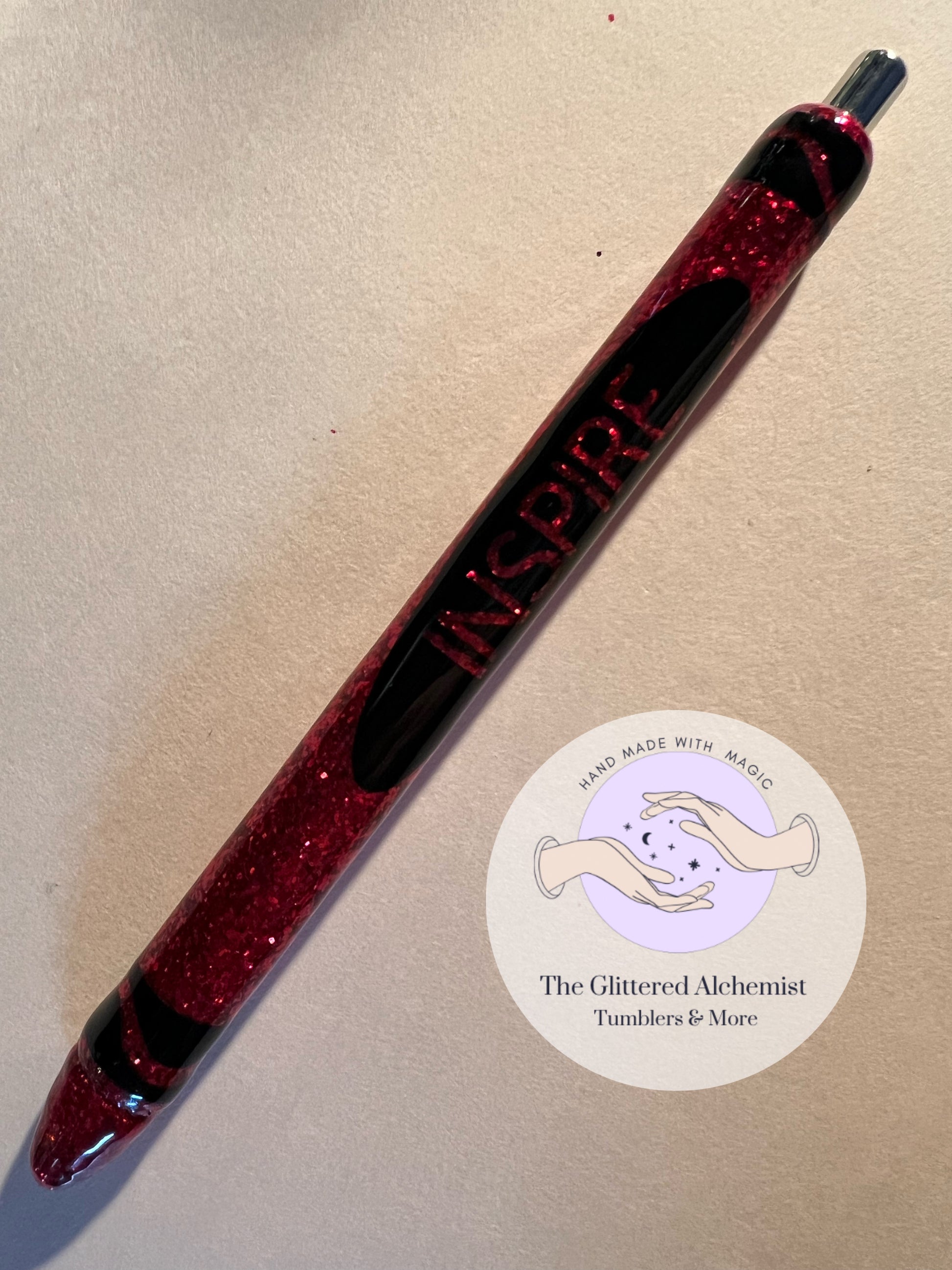 This Gel Pen offers a refillable ink cartridge with a beautiful red glitter design and an inspire decal that was inspired by crayons. Be sure to keep the spring when changing the ink cartridge, as it is a crucial component. To clean, simply use a damp cloth and dry immediately, and never put the pen in your mouth.