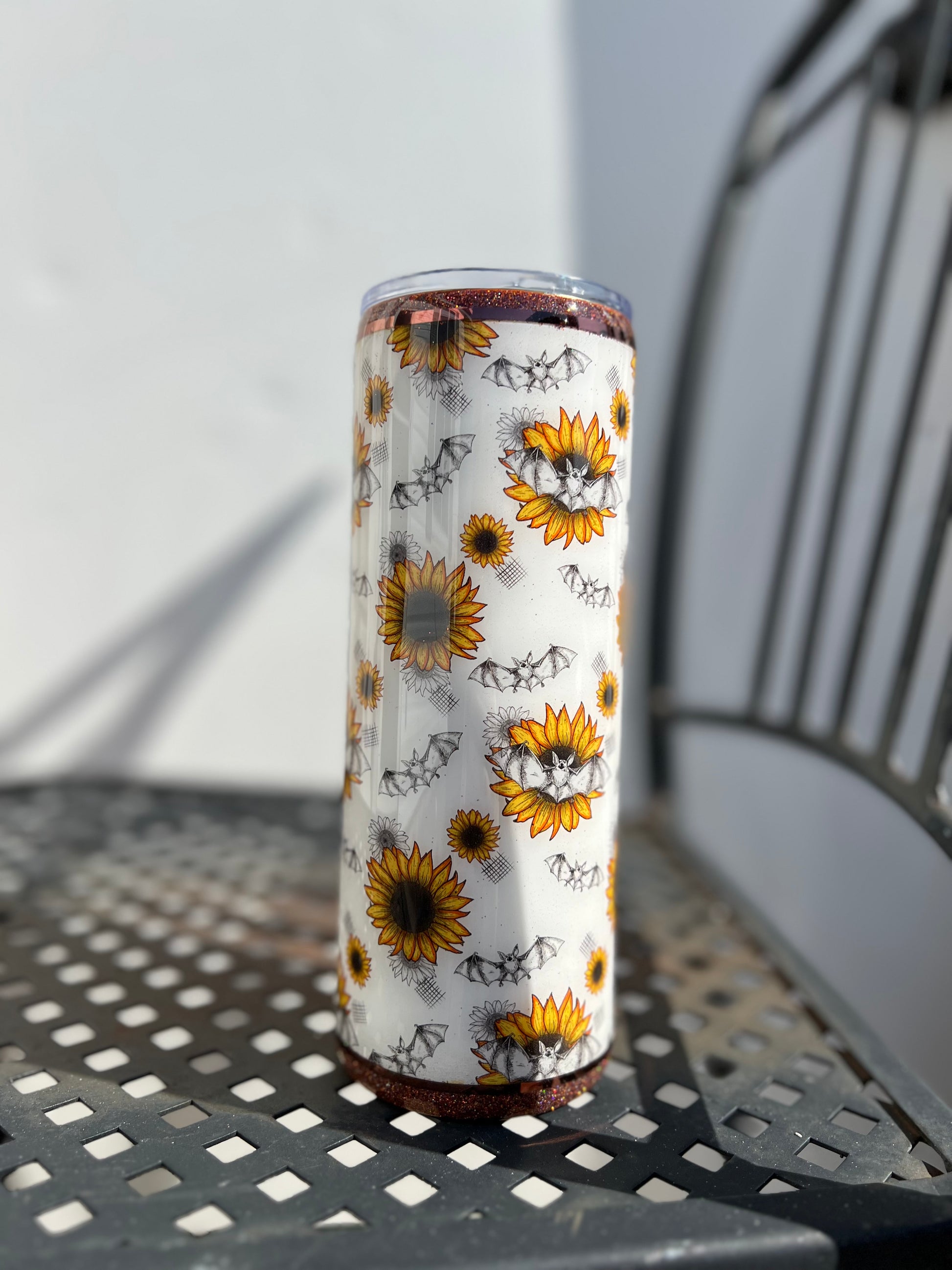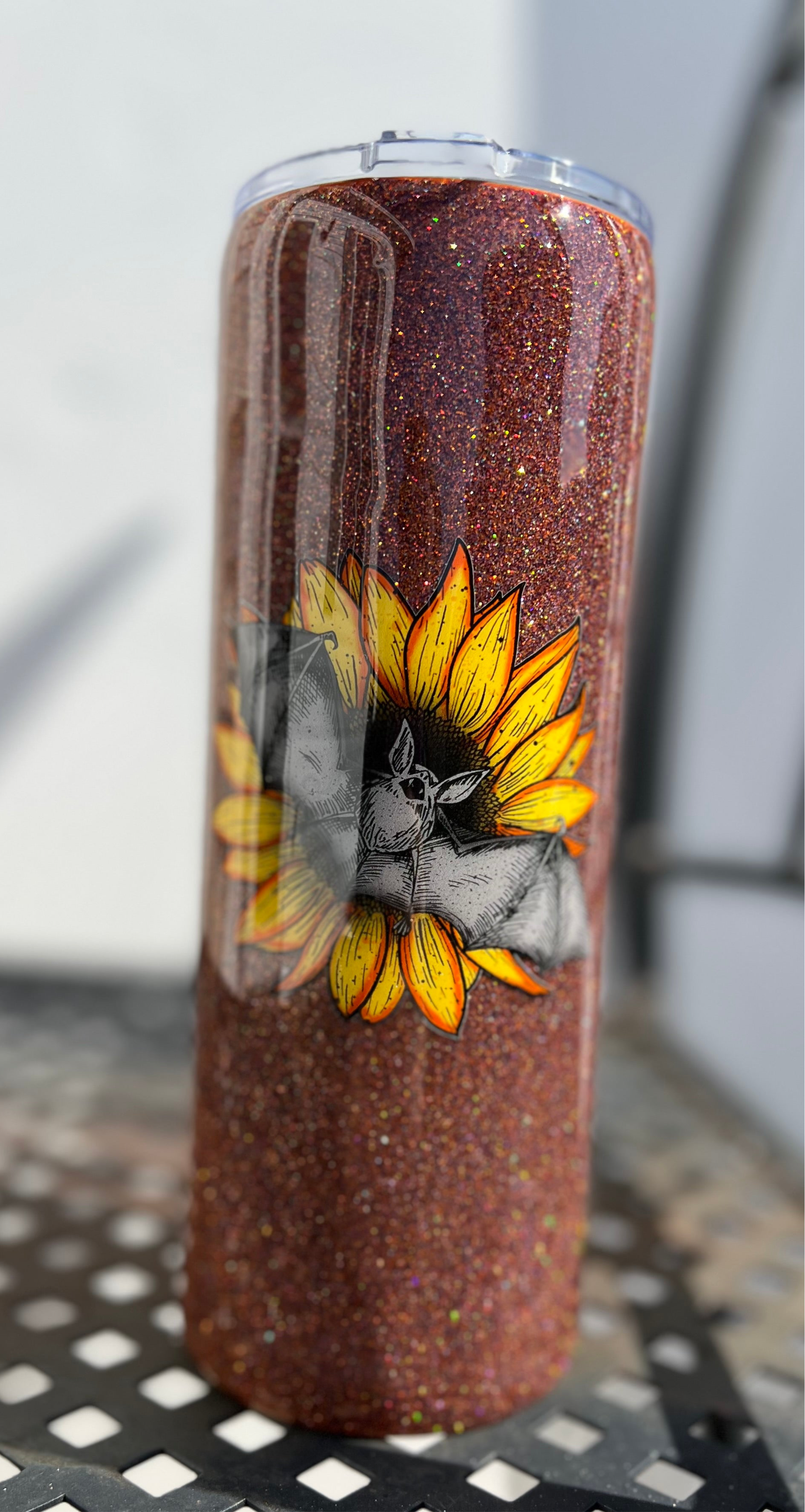 Enhance your mysterious aura with our Sunflower Bat Tumbler! Constructed with sturdy stainless steel, this 24oz tumbler showcases a fanciful depiction of a Sunflower accompanied by a bat. To add a touch of enchantment, a sprinkling of shimmering copper glitter was incorporated for a touch of sparkle. Ideal for maintaining the temperature of your beverages and displaying your distinct taste. Order now and savor your drinks in a refined manner (or concoct a magic elixir).