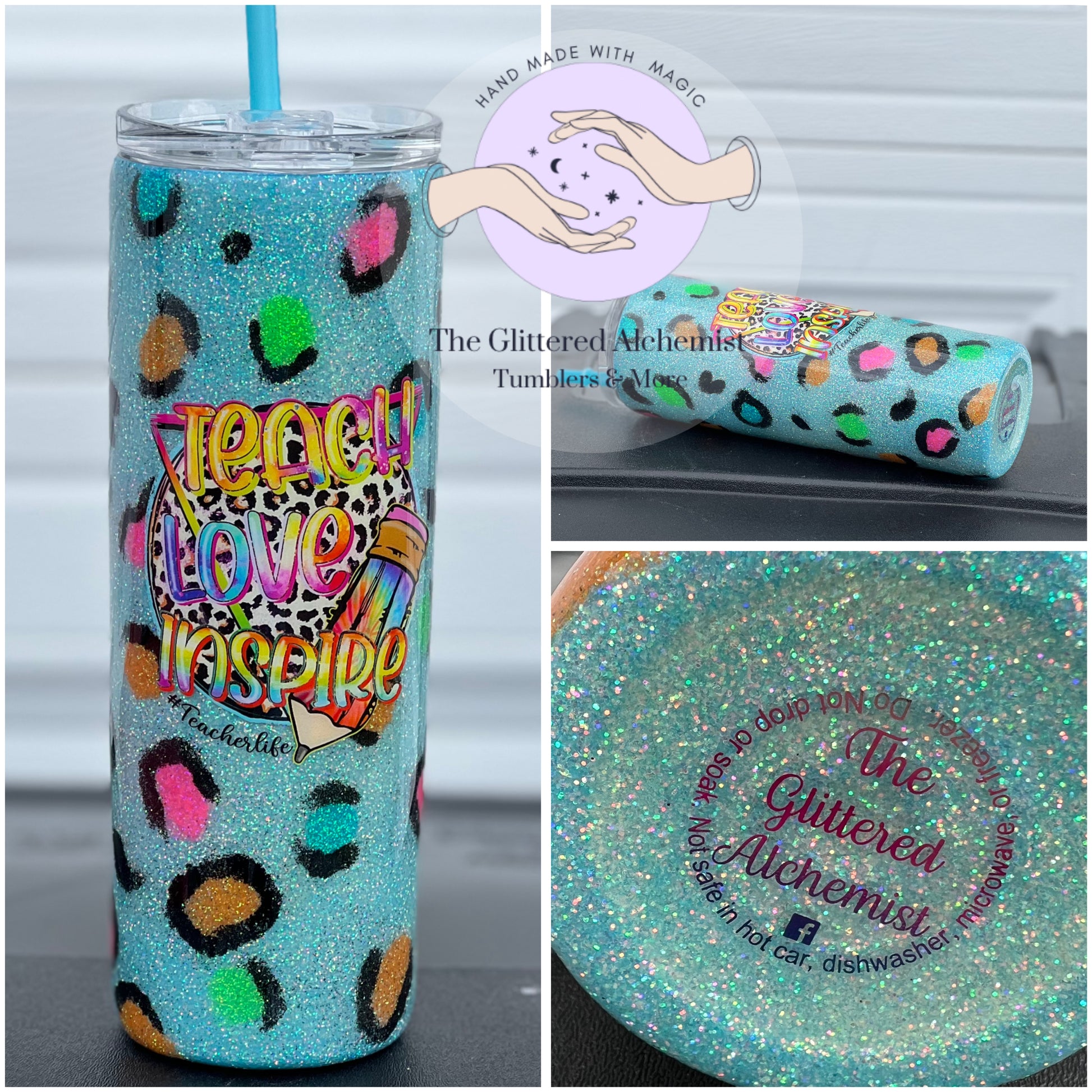 This tumbler features hand-painted leopard spots with a glitter finish, sealed with FDA-compliant epoxy. Due to the handmade nature, there may be small imperfections, such as dust particles.