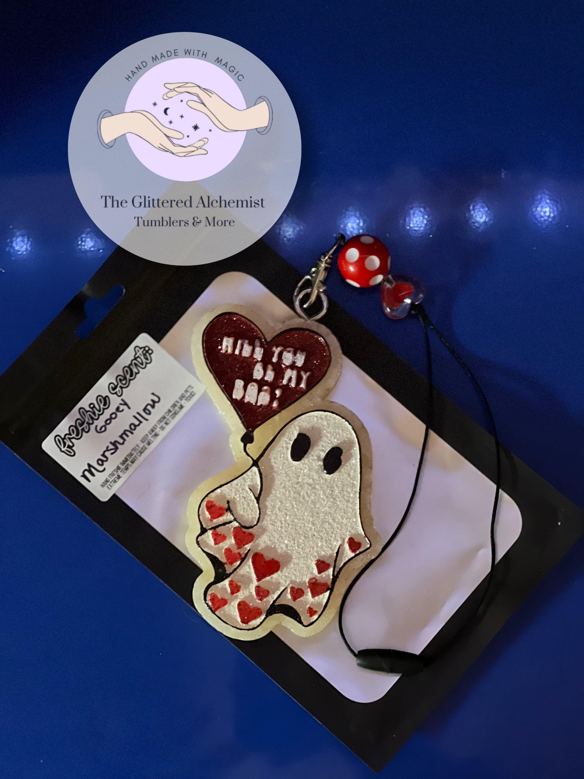 Elevate your Valentine's Day experience with the charming Valentine Boo Car Freshie. Featuring a ghost holding a heart balloon that reads "Will you be my boo?" in the enticing scent of Gooey Marshmallow, this product is perfect for hanging from your vehicle's rearview mirror with its stylish beaded hanger. You can also easily detach the hanger for a new freshie whenever desired. Don't miss out on this must-have item for your car.